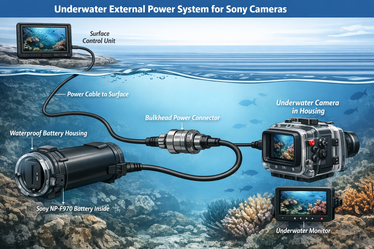 Extend your underwater camera runtime up to 3–5x using a sealed external battery system based on Sony NP-F970.